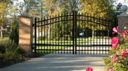 The Prestige - This beautiful arched Estate Gate in Medina, Ohio features decorative rings between the top two rails, 18” puppy pickets on the lower third of the gate and pickets capped with quad finials. The commercial swing gate operators are Elite CSW200UL’s manufactured by Chamberlain Professional Products. The stainless steel, lighted keypad is the AK-11 by Linear/OSCO.